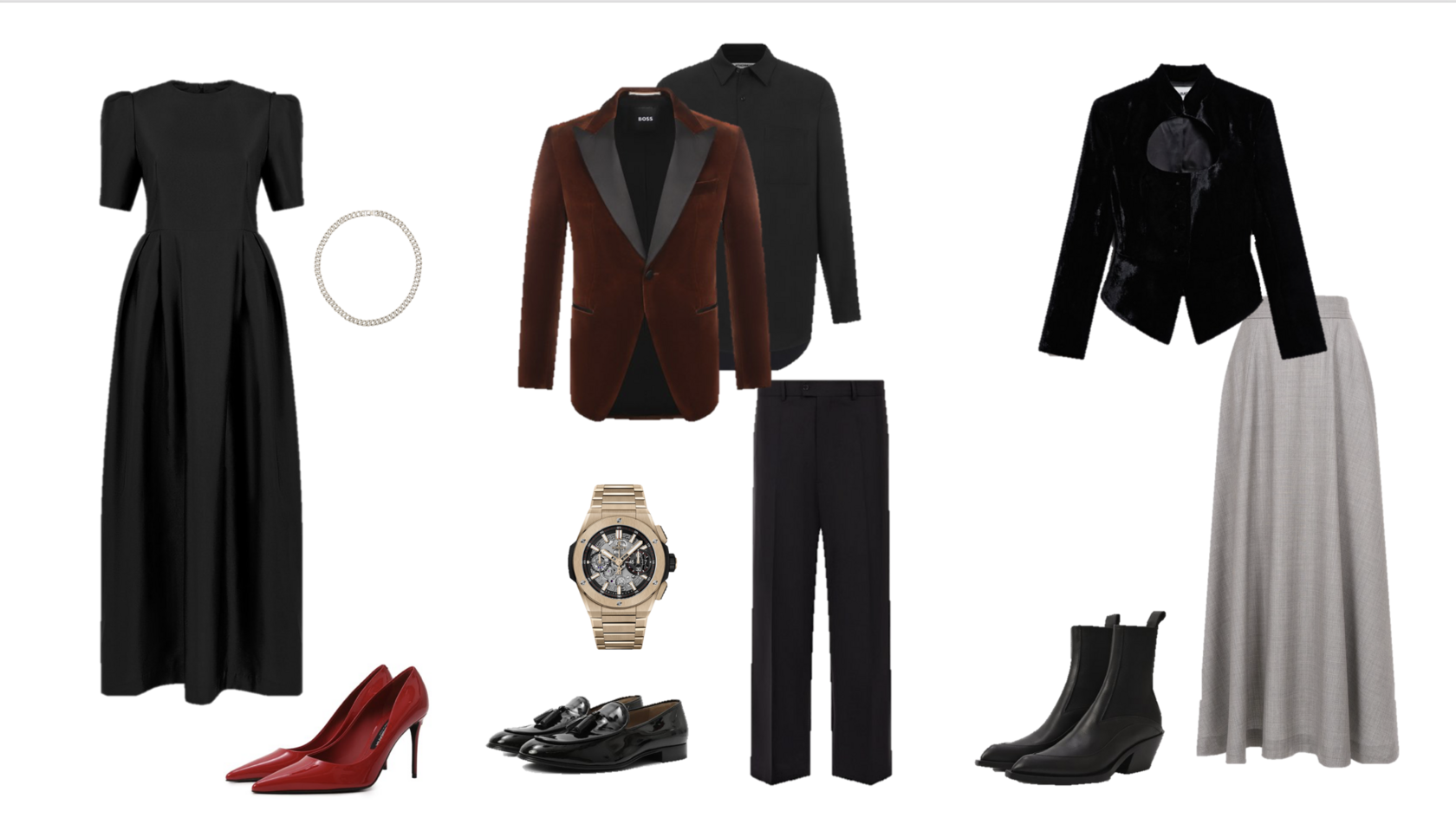 • Мужчины будут выглядеть роскошно в бархатных пиджаках и лаковых туфлях. Даже с чёрными брюками и рубашкой, добавленные дорогие часы сделают образ шикарным.